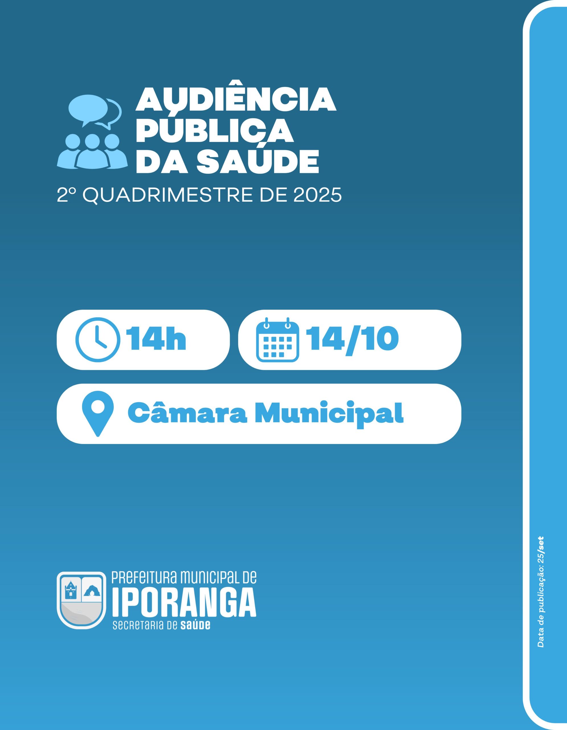 A Prefeitura de Iporanga, por meio da Secretaria de Saúde, convida toda a população para participar da Audiência Pública referente ao 2º quadrimestre de 2025.